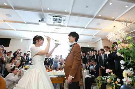 パーティが進み、いよいよケーキ入刀&ファーストバイトへ☆ ケーキ入刀後、お二人が手にしたのはBIGスプーン!ご新婦様もBIGスプーンでの挑戦に会場からも歓声が! これからの結婚生活とそれぞれの愛情の大きさと想いを載せ、「あ~ん」!! お互いの想いをしっかりとキャッチできたお二人♡仲睦まじいお姿にほっこりとした雰囲気となりました☆