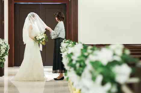 お母様より「母親が手伝う最後の身支度」という意味があるベールダウンのセレモニーがスタート。 親のもとを離れ、新郎と新しい家庭を築く娘に「幸せになってね」という願いを込めて、身支度を完成させてあげる素敵な瞬間です。 永遠の誓いをたてるお式は、おふたりだけではなく、これまで支えてくださったご家族様にもご参加いただき、ご家族での特別であたたかなお時間が流れたお式となりました。