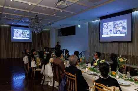 プロフィールDVDにも力を入れたお二人☆ 感謝の想いや今までの思い出を振り返りながらご覧になるDVD上映は、特別な時間が過ぎていきました・・・。そしてお二人が作られた映像に皆様も、思い出話や笑顔を見せながら楽しんでおりました。 ゆったりとお食事を楽しんだりと、映像をみながら和やかな時間が過ぎていきました・・・♡