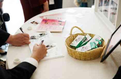 パーティスタート前、受付にてチェキを手にお写真を撮っているゲストの皆様。またお写真にはお二人に向けて祝福のメッセージも添えていただき、皆様からの祝福を感じることのできる素敵なお写真が集まりました♡ そして、ゲストの皆様にも楽しんでいただきたい!とお二人の想いがつまった素敵なパーティがスタートとなりました☆