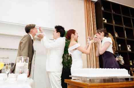 お二人の初めての共同作業となるケーキ入刀がスタート☆ベストショットを撮るために皆様カメラを構え、お二人の近くへ!その後はお二人でのファーストバイトも行われ、お二人の仲睦まじい姿に会場もほっこり☆ そして感謝の気持ちを込めて、大切なご家族たちにサンクスバイトのサプライズも行われ、大盛り上がりとなったケーキ演出でした♪