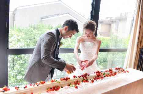 「パーティーは皆に美味しいものを食べてほしい、そして出来れば見たことが無いことをせっかくだからやってみたい。」とお話し下さったお2人。おもてなしを重視していたお二人だからこそ、ケーキでお2人らしさを取り入れることに。 景色の良い大きな窓の前には、スタッフも驚きのロングロールケーキが!カラードリップで色が変わっていくロールケーキにゲスト様も大興奮の時間でした。
