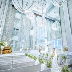 【空の旅をテーマにした純白のチャペル】未来へと希望を運ぶ気球のオブジェが、流れる滝を超え空へと飛び立つ空間の中で、おふたりとゲストの方の記憶に残る挙式を♪