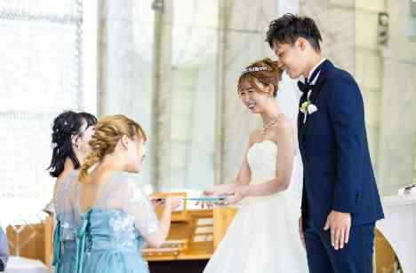 おふたりの挙式スタイルは人前式。人前式とはおふたりの結婚の誓いを神様にする代わりに家族や友人などのゲストの皆様に証人となってもらう挙式スタイルです。 そこでおふたりはご友人にブライズメイドを頼まれました。ブライズメイドとは花嫁付添人のことをいい、結婚式の準備を手伝ったり、当日のエスコートをしたりと海外のウェディングでは欠かせない役割です。ブライズメイドのお揃いドレスでより華やかさがアップします。