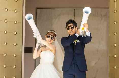 挙式後のガーデンセレモニーではおふたりともサングラスをかけ、特大バズーカをもって登場。 すでにガーデンにて準備をしているゲストの皆様はおふたりのユニークな姿にとても驚くと同時に笑顔がこぼれていました。 祝福のフラワーシャワーが青空によく映え、おふたりの最高の笑顔があいまって爽やかな印象のお写真を残すことができました。