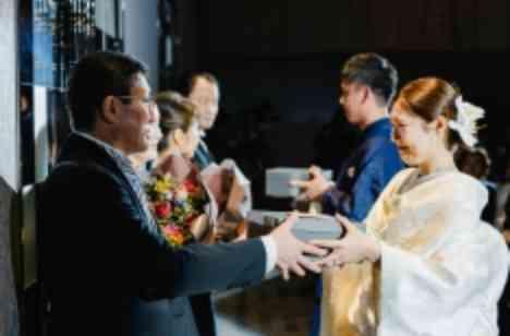 お色直し衣裳に"和装"を選ばれたおふたり。ドレススタイルの華やかなさから和装の厳かさにゲストの印象もがらりと変わりました。親御様へこれまで育ててくれた感謝の気持ちを込めて記念品の贈呈。和装ならではの温かさや神聖な雰囲気に包まれて、より一層感動的なエンディングシーンとなりました。当式場のお色直し衣裳ではカラードレスはもちろん和装も取り揃えております。おふたりのイメージに合った衣裳をご提案いたします。