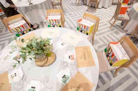 披露宴会場内は「ナチュラルウェディング」をテーマにグリーンをふんだんに使ったコーディネートに。手作りのテーブルガイドやランチョンマット、オリジナルのケーキなど、おふたりのこだわりがたくさん詰まった会場の完成です。