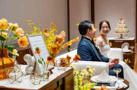 ナチュラルな雰囲気に包まれたソファコーデで、リラックスした笑顔を見せるおふたり。 ゲストとの距離も近く、まるで自宅に招いたようなアットホームな空間が広がります。 ふたりらしい飾らない自然体のスタイルが、温かく穏やかな時間を演出。 装花や小物の色味にもこだわり、空間全体が優しいトーンにまとまり、会場との一体感も抜群です。