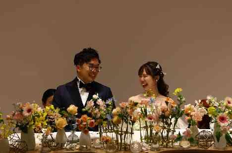 ゲストの祝福に包まれ、メインテーブルに並ぶおふたりの笑顔が輝くひととき。 長い準備期間を経て迎えたこの日を、心から楽しみ、リラックスした自然な表情が印象的です。 会場の中心で温かく穏やかな空気が流れ、ゲストとの一体感や幸せな時間が感じられました。 おふたりの笑顔はこれから始まる新しい人生への期待と、互いへの深い絆の証。 まさに最高の瞬間がここに刻まれています。