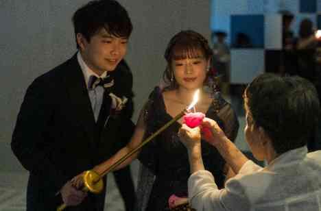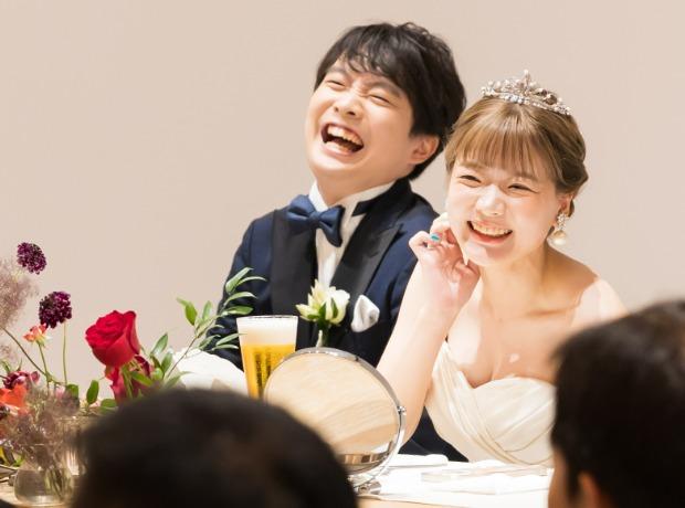 披露宴では、おふたりが各テーブルを回りながらキャンドルサービスを行いました。 温かな光を手渡しするおふたりの笑顔に、ゲストも自然と笑顔があふれ、会場全体に和やかであたたかい雰囲気が広がります。 直接感謝の気持ちを届けられるひとときは、親密さと温かさを感じられる特別な時間となりました。 ゲストとの距離が近く、おふたりらしい心あたたまる演出が印象に残るセレモニーです。