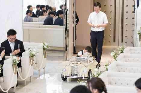 披露宴でのお子様によるリングセレモニーは、ラジコンカーに乗せた指輪を運ぶユニークな演出で会場を盛り上げました。 小さな手でラジコンカーを操作しながら、大事な指輪を運ぶ姿にゲストは思わず笑顔と歓声。 おふたりらしい遊び心が光る瞬間で、親子の絆や家族の温かさも感じられる特別なセレモニーとなりました。 忘れられない、ほほえましくも感動的なひとときです。