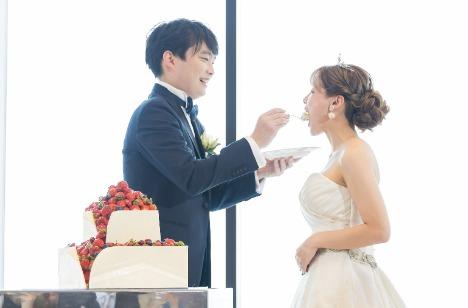 披露宴では、新郎様から新婦様へのサプライズケーキバイトが行われました。 新郎様がケーキをそっと口元へ運ぶ優しい仕草に、新婦様は満面の笑みで応えます。 ゲストからは温かな拍手と歓声が沸き起こり、会場全体が笑顔に包まれました。 おふたりらしい自然体のやり取りが微笑ましく、忘れられない心温まるワンシーンとなりました。