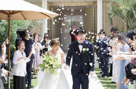 挙式や披露宴の合間にガーデンへ出たおふたりは、ゲストからのフラワーシャワーで華やかに祝福されました。 色とりどりの花びらが風に舞い、太陽の光にきらめきながらおふたりを包み込みます。 ゲスト一人ひとりの笑顔と拍手に囲まれ、会場全体が温かく和やかな空気に満たされました。 自然の光と花に彩られた、思い出に残る特別なひとときとなりました。