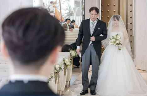 バージンロードの扉が開き、お父様に手を取られた新婦様がゆっくりと歩みを進めます。 一歩一歩にこれまでの思い出が重なり、会場には温かな空気が満ちていきます。 その先で新郎様はまっすぐに新婦様を見つめ、優しく微笑みながらその瞬間を待ちます。 家族の愛と新たな絆が交わる、美しく感動的なひとときとなりました。
