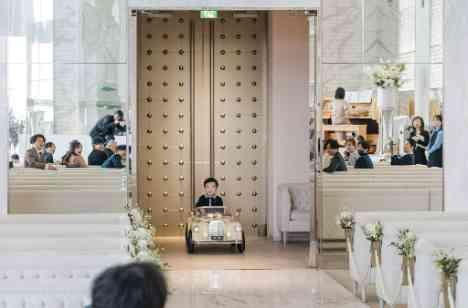 挙式では、小さなお子様がラジコンカーに乗せた指輪をおふたりに届けるユニークなセレモニーが行われました。 会場中の視線が小さなヒーローに集まり、可愛らしい姿に自然と笑顔と歓声が広がります。 おふたりも優しい眼差しで受け取り、微笑み合う温かい時間。 ゲストと一緒に楽しむことのできる、心に残る印象的で愛らしいひとときとなりました。