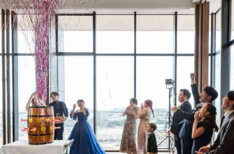 披露宴では、ゲスト参加型の樽ゲームが行われ、会場中が大盛り上がり。 勝利を目指して楽しむゲストの笑顔と歓声が響き、自然と拍手や笑い声が広がります。 ゲームの勝者には豪華景品が贈られ、喜びにあふれる瞬間も。 おふたりもゲストと一緒に楽しみながら笑顔を交わし、会場全体が温かく明るい幸せな雰囲気に包まれるひとときとなりました。