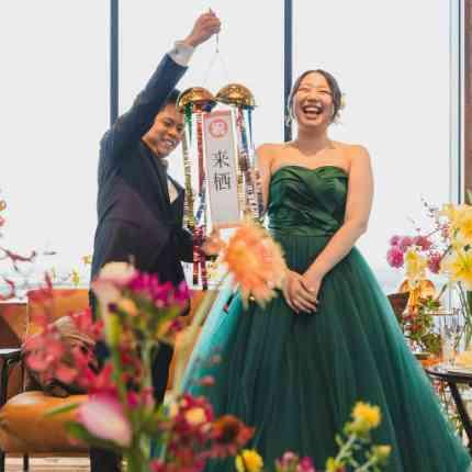 披露宴前、会場にはウェルカムガチャが設置され、ゲストは楽しそうに回しながらゲーム参加者を決めていきます。 「どんな結果になるかな?」と期待に胸を膨らませる笑顔があちこちに広がり、自然と会場の雰囲気も明るくなります。 おふたりもゲストの様子を楽しそうに見守り、和やかで笑顔あふれるひととき。 披露宴の始まりから、温かくワクワクする時間が会場全体を包みました。