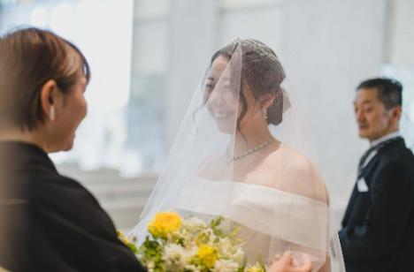 挙式前、新婦様はお母様にベールダウンをしていただく特別なひととき。 小さな頃から見守ってくれた母の手に包まれ、少し照れながらも自然な笑顔を見せる新婦様。 「幸せになってね」という想いが込められた優しい手のひとつひとつに、会場全体が温かな空気に包まれます。 親子の絆と感謝が伝わる、心に残る美しい瞬間となりました。