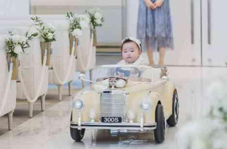 挙式では、小さなお子様がラジコンカーに乗せた指輪をおふたりに届けるユニークなセレモニーが行われました。 笑顔で見守るゲストの中、かわいらしい小さな手と車に注目が集まり、自然と笑い声と歓声が広がります。 おふたりも優しい眼差しで受け取り、微笑み合う温かなひととき。 参加型の楽しい演出に、会場全体が幸せに包まれる印象的な瞬間となりました。