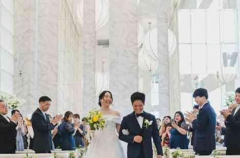 挙式の最後、おふたりは笑顔で手を取り合い、バージンロードをゆっくりと退場されました。 緊張と喜びが入り混じる表情に、これから共に歩む人生への決意が感じられます。 会場からは温かい拍手と祝福の声が降り注ぎ、親族やゲストの笑顔があふれるひととき。 チャペルに差し込む光に包まれ、祝福と幸せが満ちる、心温まる感動の瞬間となりました。