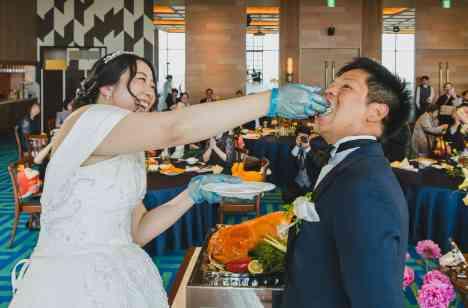披露宴では、ウエディングケーキの代わりに豚の丸焼きを用いたユニークな演出が行われました。 おふたりが笑顔で互いに食べさせ合うたびに、会場には驚きと笑い声が広がり、自然と温かい拍手も起こります。 ゲストも一緒に楽しむ、和やかでアットホームなひととき。 愛情と遊び心があふれる、印象的で忘れられない楽しい演出となりました。