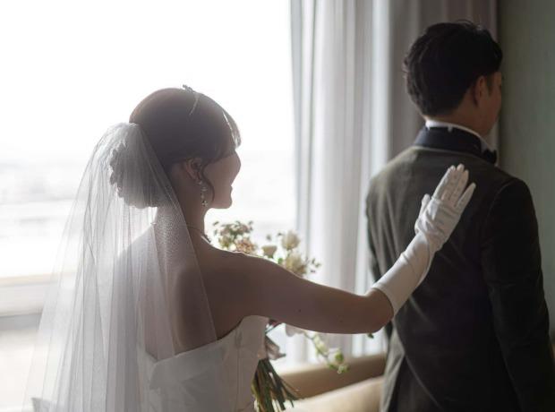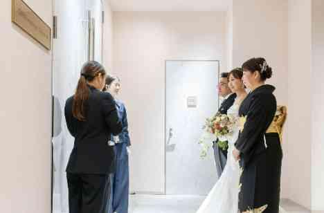 挙式前、扉の向こうに広がる美しい景色を前に、新婦様と親御様、そして式場スタッフが揃い、扉前で静かにスタンバイしました。交わされる笑顔には緊張と期待が入り混じり、ささやかな会話やまなざしのやり取りからは、これから始まる特別な一日の予感が感じられました。忘れられない「始まりの瞬間」をそっと予感させる、印象深いシーンとなりました。
