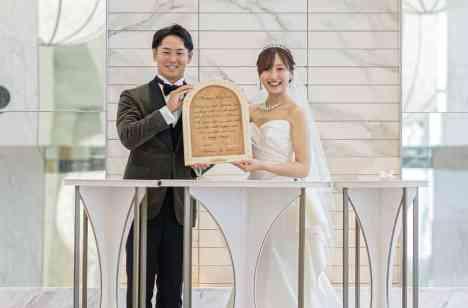 挙式の中では、お母様が心を込めて手作りされた結婚証明書が、ゲストの皆さまに丁寧に披露されました。手作りならではの温かさや想いが伝わる証明書に、会場からはやさしいまなざしが注がれ、おふたりの表情にも自然と笑顔があふれました。ご家族の深い”愛情”と”絆”が感じられる、心に残る温かな印象的なシーンとなりました。