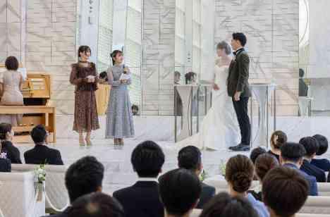 人前式では、新郎新婦と友人たちが向かい合い、それぞれ心を込めて誓いの言葉を交わしました。天井高15メートルの白く幻想的なチャペルには、柔らかな光が降り注ぎ、二人を見守る友人たちの温かいまなざしが包みます。誓いの言葉が真っすぐに届くたびに会場には笑顔が広がり、幸せにあふれる、心に深く残る特別なひとときとなりました。