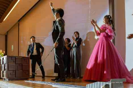 披露宴の楽しいひととき、ゲストも参加したパターゴルフ対決がスタートしました。緊張感の中、Aさんが見事ホールインに成功すると、思わずガッツポーズ!歓声や笑い声が会場中に響き渡り、手拍子や笑顔が飛び交います。おふたりも思わず顔を見合わせて笑い、ゲストと一体となって楽しむ、和やかで盛り上がりに満ちた心温まる時間となりました。