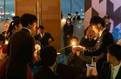 披露宴の温かいひととき、ゲストも参加するキャンドルリレーが始まりました。一つひとつの灯りが手から手へと渡されるたびに、家族や友人、ゲストの想いがつながっていく象徴的な瞬間です。柔らかな光に包まれた会場には祝福の空気と絆のあたたかさが満ち、笑顔や小さな感嘆の声が響く中、心に深く残る感動的で温かな時間がゆっくりと流れました。