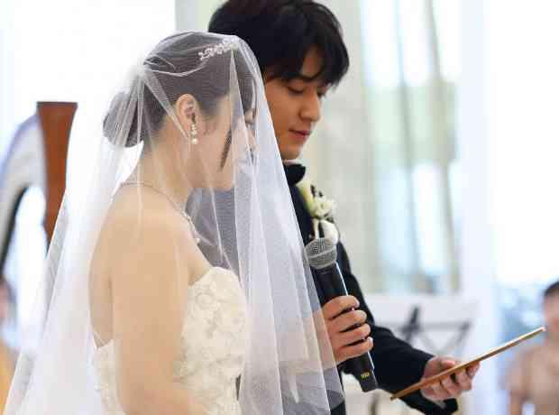 純白のチャペルの中で、新郎と新婦が向かい合う”特別な瞬間”。互いの表情をじっと見つめ合い、これから始まる新しい人生への期待や喜びが静かにあふれます。天井から降り注ぐ柔らかな光に包まれ、緊張と温かさが入り混じる中、二人だけのかけがえのない時間がゆっくりと流れ、会場全体にも穏やかで優しい空気が満ちました。