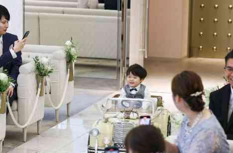 挙式中に可愛らしいサプライズがありました。お二人のお子様がラジコンカーに乗ってリングボーイとして会場に登場すると、その愛らしい姿にゲストの笑顔が自然とこぼれます。小さなヒーローの一生懸命な動きや愛嬌あふれる表情に、会場全体が和やかな雰囲気に包まれ、ほっこりと心温まる、忘れられない特別な瞬間となりました。