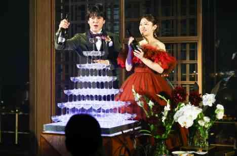 披露宴の華やかな演出のひとつ、シャンパンタワーが登場しました。新郎新婦が上からシャンパンを注ぐと、グラスが次々に輝く滝のように溢れ出し、泡のきらめきと光が会場全体に広がります。ゲストの歓声や拍手が響き渡り、笑顔があふれる中、祝福ムードが最高潮に達する華やかで盛り上がりに満ちた、忘れられない一幕となりました。