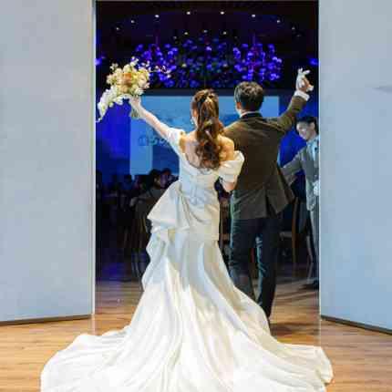 挙式前に行われたファーストミートの瞬間。満面の笑みを浮かべる新郎の表情から、新婦の深い愛情が自然と伝わり、二人の視線がしっかりと重なります。その姿に周りも思わず笑顔に包まれ、緊張がほぐれ、喜びと幸せがあふれる中、手を取り合いながら二人だけの特別で温かな時間がゆっくりと流れ、心に深く刻まれるかけがえのないひとときとなりました。
