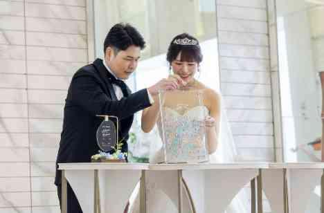 挙式中盤、ゲストが受付後に手を添えて作成していたサンドセレモニー。最後に新郎新婦が自ら色とりどりの砂を注ぎ、二人だけのオリジナルデザインが完成します。ゲスト一人ひとりの想いも一緒に重なったその瞬間、チャペル全体が温かく祝福の雰囲気に包まれ、二人とゲストの絆の深さを感じさせる、心に残る感動的で特別なひとときとなりました。