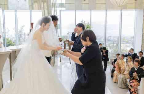 ジャケットセレモニーを終え、新郎様はお母様と穏やかにハグを交わします。 これまで育ててくれた感謝の気持ちと、今日という特別な日の喜びが自然とあふれる瞬間です。 温かく包み込むお母様の手と、新郎様のやさしい表情からは、深い絆と愛情が伝わってきます。 ゲストの温かい祝福に囲まれた中でのこのひとときは、家族のつながりを感じる、心に残る時間となりました。