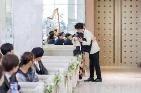 ジャケットセレモニーを終え、新郎様はお母様と穏やかにハグを交わします。 これまで育ててくれた感謝の気持ちと、今日という特別な日の喜びが自然とあふれる瞬間です。 温かく包み込むお母様の手と、新郎様のやさしい表情からは、深い絆と愛情が伝わってきます。 ゲストの温かい祝福に囲まれた中でのこのひとときは、家族のつながりを感じる、心に残る時間となりました。