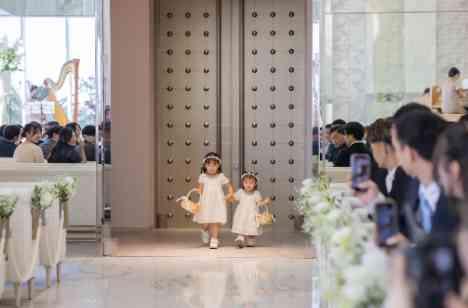 挙式では、小さなリングガールが大切な指輪をおふたりのもとへ運ぶ、微笑ましいひとときがありました。 一生懸命に歩く姿に、会場からは自然と笑顔と温かな拍手が広がります。 おふたりも優しい眼差しで見守り、その愛らしい姿に思わず笑顔に。 やわらかな空気に包まれたこのシーンは、挙式に温もりとやさしさを添える、心に残る特別な瞬間となりました。