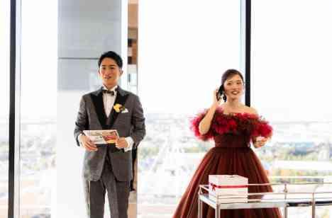 披露宴では、おふたりによるテレフォンゲームが行われました。 ランダムにつながったゲストに景品が贈られるサプライズ演出に、会場は大盛り上がり。 「誰に当たるの?」と期待に包まれる中、電話がつながる瞬間には歓声と笑い声が広がります。 おふたりも楽しそうにやり取りをしながら、ゲストと一体となって笑顔あふれる時間に。 遊び心たっぷりの余興は、心に残る楽しいひとときとなりました。