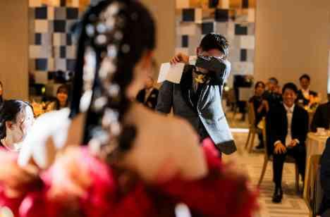 披露宴では、新郎様から新婦様へサプライズの手紙が贈られました。 突然の出来事に驚きながらも、真剣な表情で言葉を受け止める新婦様。 一言一言に込められた想いが会場に静かに広がり、やがて温かな涙と拍手に包まれていきます。 これまでの感謝とこれからの未来への想いが重なる、心に深く響くひととき。 おふたりの絆をより一層感じる、忘れられない特別な時間となりました。