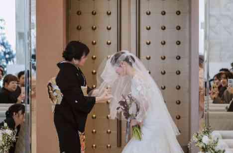 チャペルにて執り行われたベールダウンのセレモニー。新婦様はお母様の手にそっと包まれ、これまでの愛情と想いを感じながら静かに目を閉じられます。お母様が丁寧にベールを下ろすその瞬間には、言葉にならない深い絆と感謝が溢れ、会場は温かな空気に包まれました。新しい人生へと送り出す、家族の愛が感じられる感動的なワンシーンとなりました。
