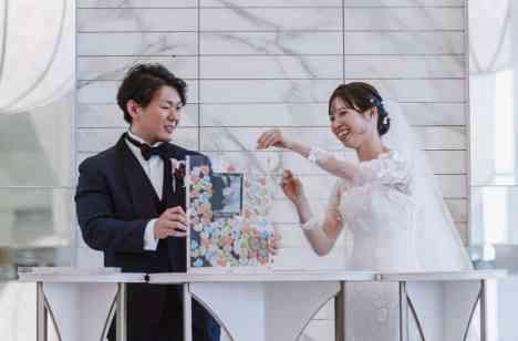 ゲストの皆様が一枚ずつハート型のパネルにお名前を書き、想いを重ねて完成へと近づいていく結婚証明書。チャペルにて最後のピースを新郎新婦様が仕上げると、世界にひとつだけの証明書が完成します。おふたりは微笑みながら出来上がった作品を見つめ、ゲストと共に創り上げた絆の証に喜びを感じる、あたたかなワンシーンとなりました。