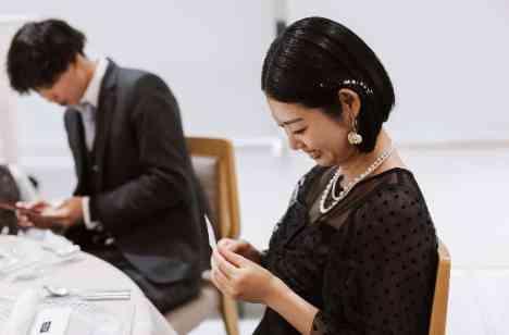 披露宴会場では、ゲストの皆様が順番にお席へとご着席される中、テーブルには新郎新婦様から一人ひとりへ向けた心温まるメッセージが添えられています。その想いに触れながら読み進めるゲストの表情には自然と笑みがこぼれ、嬉しさと感動が広がっていきます。おふたりの感謝の気持ちが丁寧に伝わる、優しさに満ちた印象的なワンシーンとなりました。