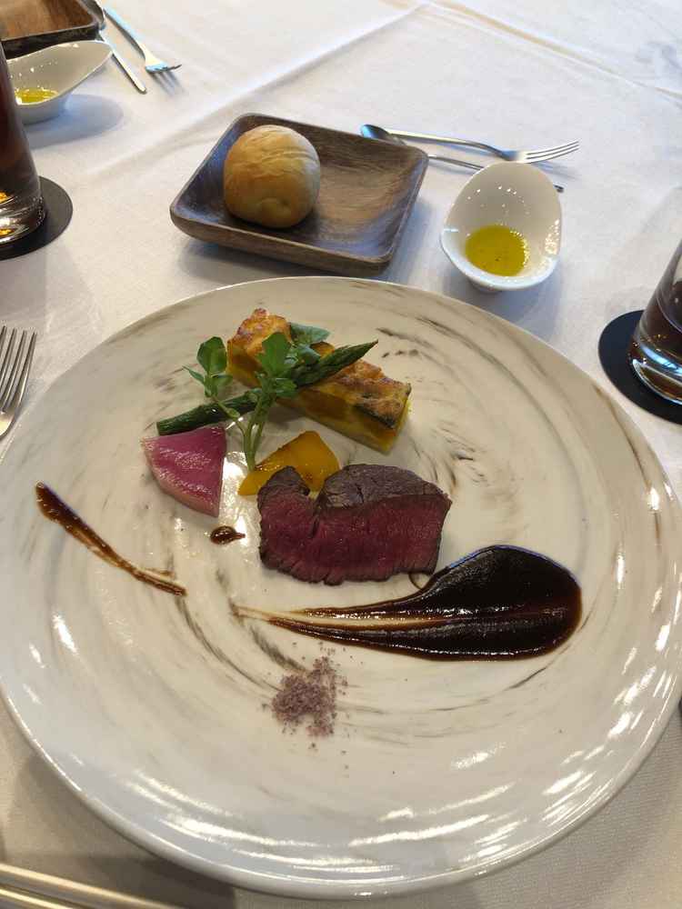 カシスパンは、香りもよく珍しくてよかった。 肉は、レア過ぎたかな?と感じた。