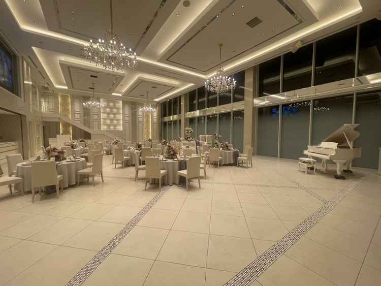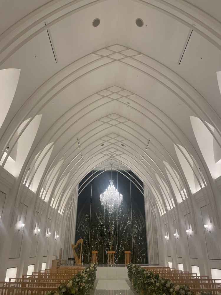 白を基調としてて華やかな雰囲気をしています。夜景やライトアップも綺麗で夜挙式するのも間違いないし、昼間の時間でもきっと綺麗だなと思いました。