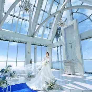 会場のシンボルであるクリスタルチャペルは、海と空の青がしなやかにつながりをみせる幻想的な空間です。