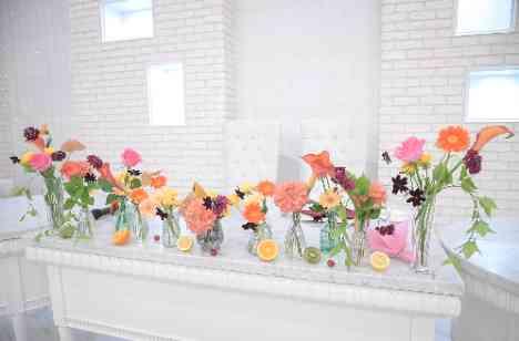 チャペルの感動的な雰囲気とはガラッと変えて明るい雰囲気にしたかったので、お花の色やテーブルの小物などカラーをたくさん取り入れました。 ナフキンの色を交互に変えたり、フルーツを使ったりしたことで、白基調の披露宴会場も自分好みの色にすることができました。 会場コーディネートでも自分たちらしさを感じてもらえたと思います。