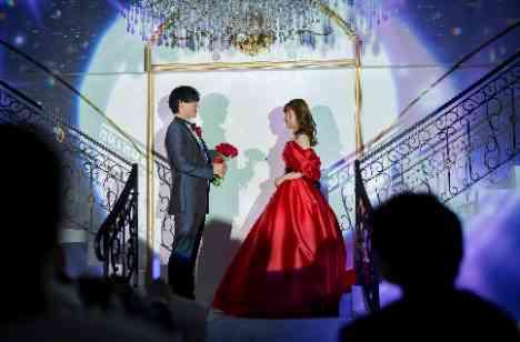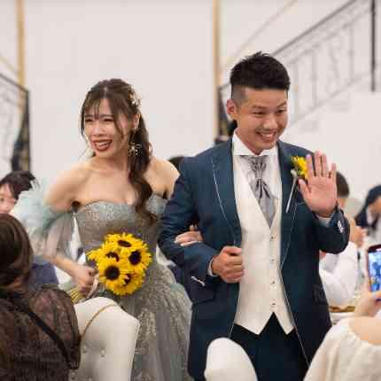 1番拘った部分はお色直しの再入場です。どうしてもペンライトを振ってもらって、ライブのような雰囲気にしたく、曲もイケイケな曲を選びました。 それに合わせてプロジェクションマッピングも盛り上がるような映像にしていただきました。 また、再入場時のダーズンローズセレモニーは、曲に合わせ司会者さんからの提案もありうまく組み込むことが出来ました。