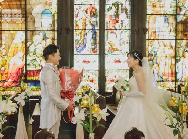 セント・ラファエロチャペル御堂筋で結婚式をすると決めたのは、とにかくチャペルが素敵だったからです。 全面に広がるステンドグラスをはじめ、2台あるパイプオルガンや聖歌隊の方が生で歌ってくださるなど、雰囲気がとても素敵です。 ゲストに見守ってもらう姿、写真に残る姿を想像し、そのチャペルの雰囲気に合うウエディングドレスを選びました。