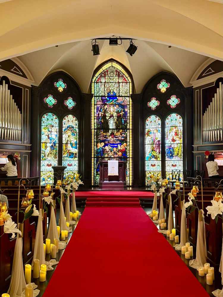 挙式会場のステンドグラスがとても綺麗でおすすめです。また披露宴会場の横にあるプールも昼と夜で印象が変わり、特に夜のキャンドルが綺麗だと思いました。